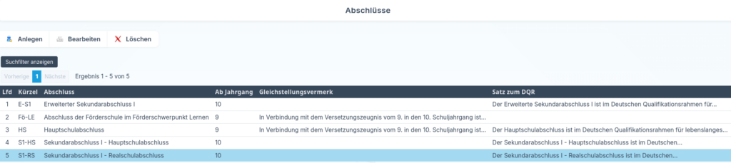 Im Bereich Stammdaten → Abschlüsse können Sie die verschiedenen Arten von Schulabschlüssen an Ihrer Schule anlegen.