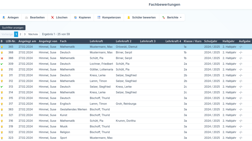 - Lehrkraft 1–4: Hier können Sie bis zu vier Lehrkräfte eintragen, die Zugriff auf diesen Unterricht haben und Bewertungen vornehmen dürfen.