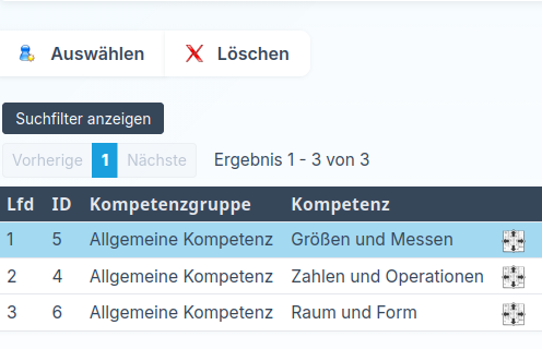 Über den Button Auswählen sehen Sie alle Kompetenzen, die für diesen Unterricht grundsätzlich verfügbar sind, aber noch nicht zugeordnet wurden. Diese Kompetenzen werden im Bereich Stammdaten → Kompetenzen angelegt.
