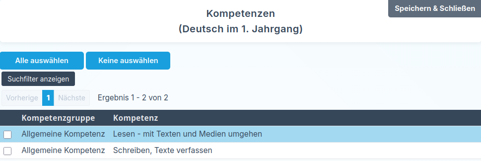 Wenn Sie bei einer Kompetenz die Checkbox aktivieren und anschließend auf Speichern & Schließen klicken, wird die Kompetenz dem Unterricht zugeordnet.