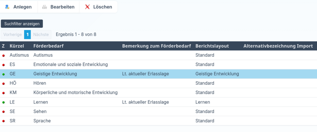 - Kürzel: Daneben sehen Sie das hinterlegte Kürzel des Förderbedarfs.