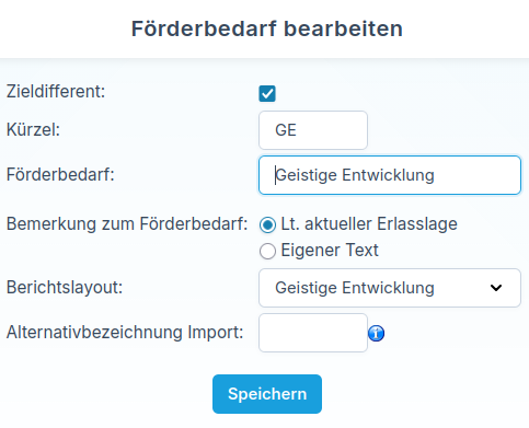 - Förderbedarf: Hier hinterlegen Sie die ausgeschriebene Bezeichnung des Förderbedarfs.