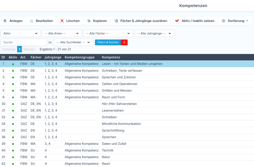 In der Übersicht sehen Sie alle vorhandenen Kompetenzen mit den jeweils zugehörigen Informationen: