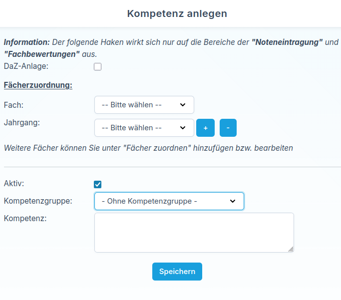 Wenn Sie die Option DaZ-Anlage aktivieren, ist diese Kompetenz ausschließlich für die DaZ-Anlage vorgesehen und kann nicht im Bereich Fachbewertung ausgewählt werden. Bleibt diese Option deaktiviert, handelt es sich um eine Kompetenz für die Fachbewertung.