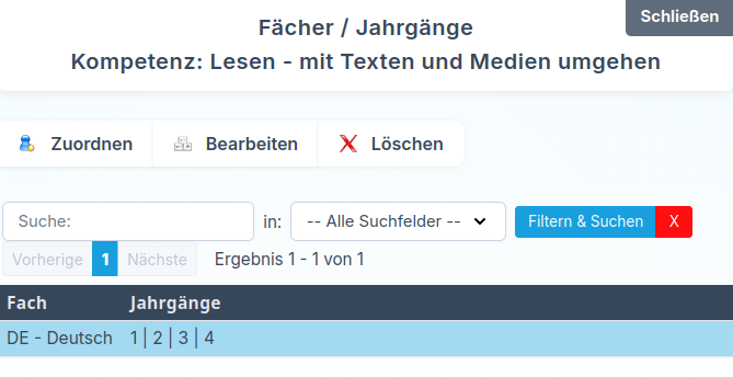 Wählen Sie dazu die gewünschte Kompetenz aus und klicken Sie auf Fächer & Jahrgänge zuordnen. Anschließend sehen Sie in der Maske, für welche Fächer und Jahrgänge diese Kompetenz bereits hinterlegt ist.