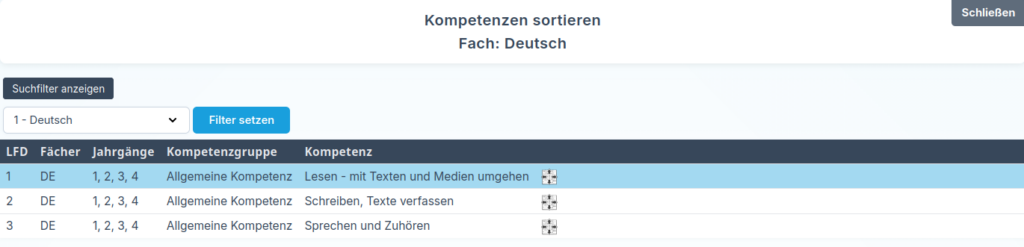 - Kompetenzgruppe: Zusätzlich wird die Kompetenzgruppe angezeigt, also die Überschrift, unter der die Kompetenz geführt wird.