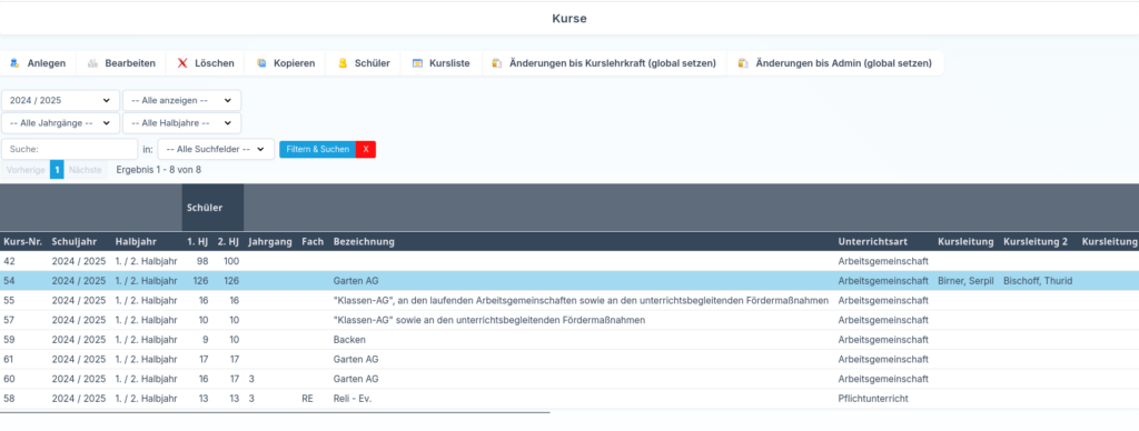 - Schülerzahlen: Zusätzlich wird angezeigt, wie viele Schülerinnen und Schüler sich im jeweiligen Halbjahr in dem Kurs befinden.