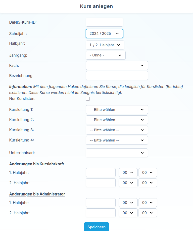 Beim Anlegen eines Kurses müssen je nach Kursart unterschiedliche Angaben hinterlegt werden.