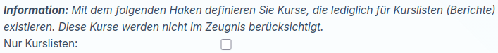 Außerdem steht Ihnen eine Option zur Verfügung, mit der ein Kurs nur für Kurslisten berücksichtigt werden kann. Wenn Sie diese Checkbox aktivieren, wird der Kurs nicht auf dem Zeugnis angezeigt.