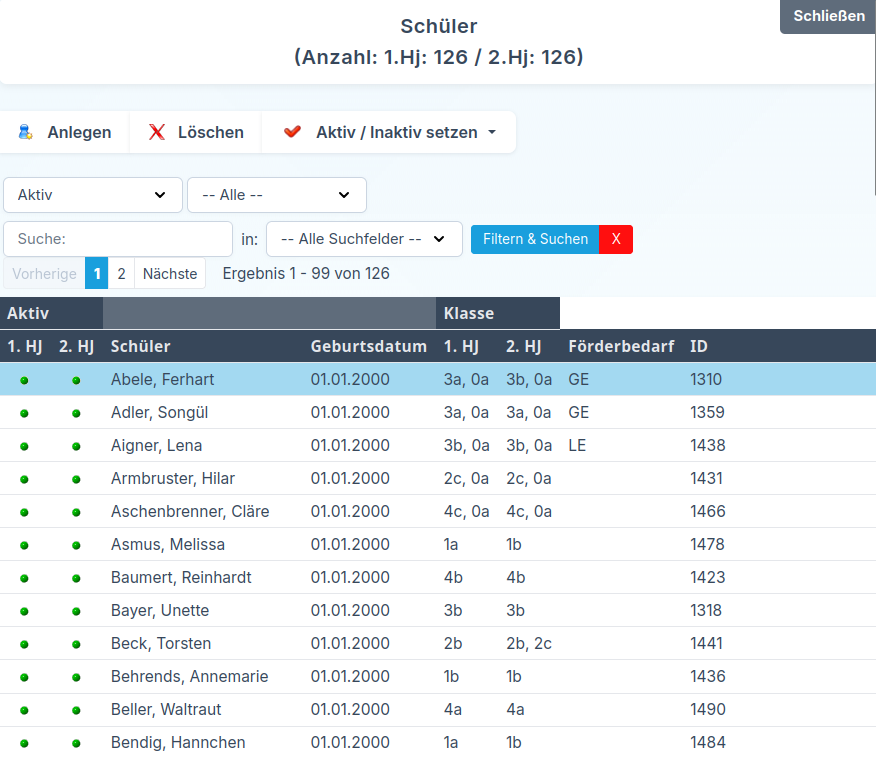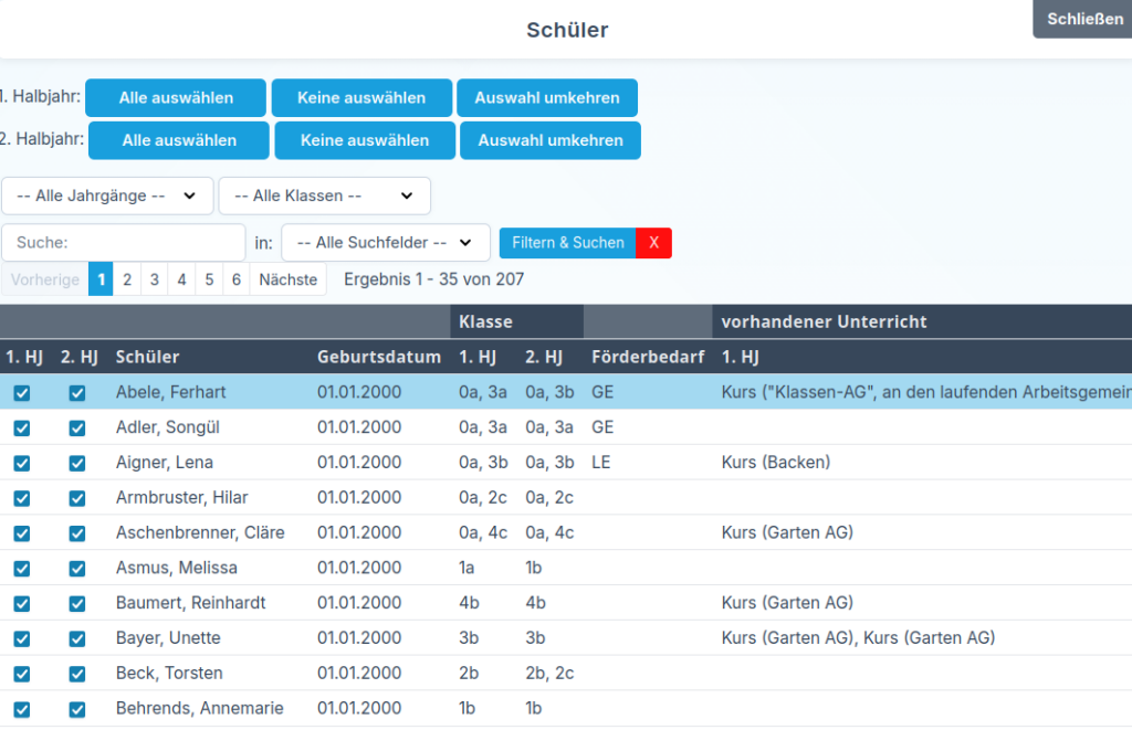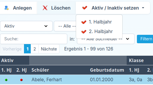 Im oberen Bereich der Maske steht Ihnen außerdem eine Schnellauswahl zur Verfügung. Damit können Sie alle Schülerinnen und Schüler, die aktuell auf der Seite angezeigt werden, für das 1. Halbjahr oder 2. Halbjahr gesammelt aktivieren oder inaktiv setzen.