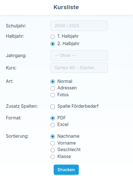 Über den Button Kurslisten können Sie für den ausgewählten Kurs eine Kursliste erstellen.