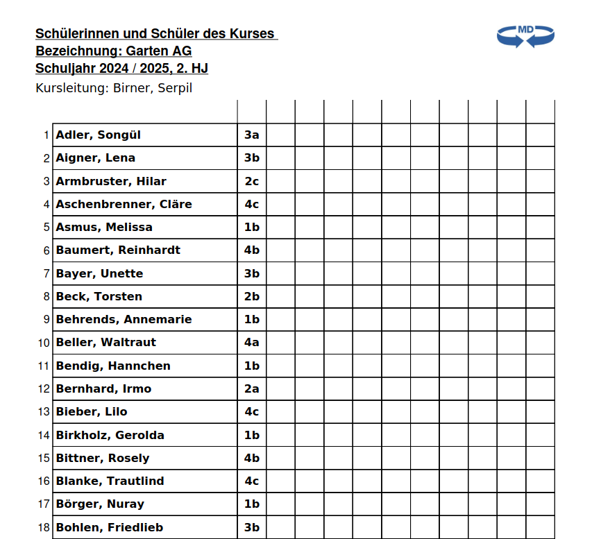 - Jahrgang: In dieser Spalte wird der Jahrgang angezeigt, den Sie beim Anlegen des Kurses ausgewählt haben. Bei Arbeitsgemeinschaften bleibt dieses Feld in der Regel leer.