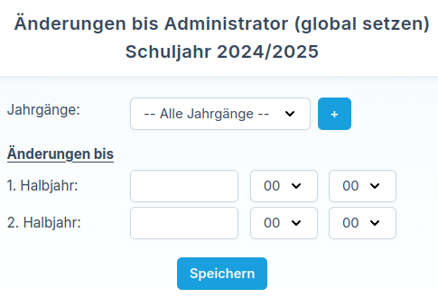 Bei den Änderung-bis-Daten legen Sie fest, bis wann ein Kurs bearbeitet oder bewertet werden darf. Dabei können Sie unterschiedliche Fristen für Fachlehrkräfte und Administratoren hinterlegen. Über den Datumspicker wählen Sie das gewünschte Datum aus, über die danebenliegenden Auswahlfelder die jeweilige Uhrzeit.