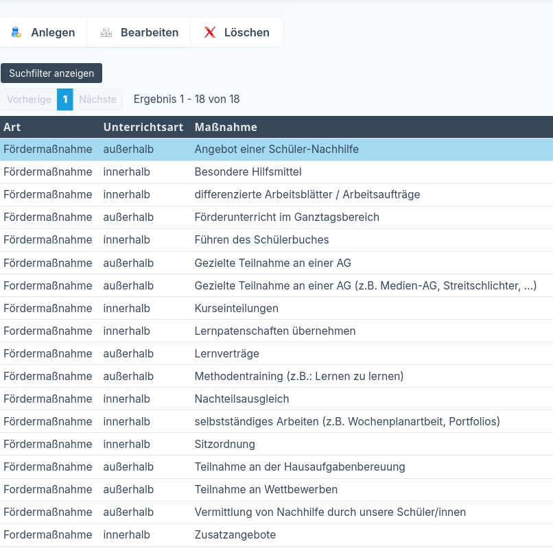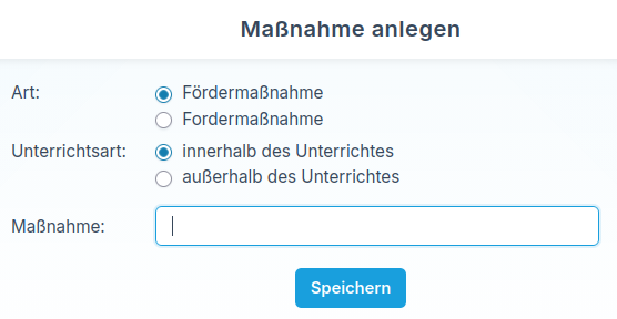 Im Bereich Stammdaten → Maßnahmen können Sie die Maßnahmen für Ihre Förder- oder Forderpläne anlegen. Diese stehen Ihnen später im Bereich ILE als Textbausteine zur Verfügung.