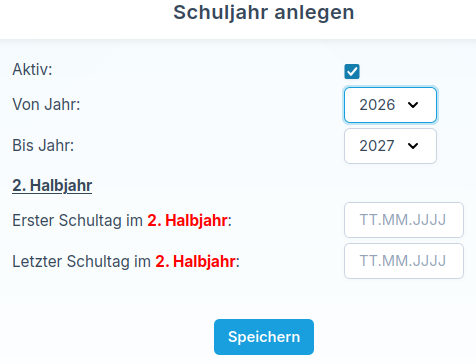 Im Bereich Stammdaten → Schuljahre müssen Sie einmal pro Jahr das neue Schuljahr anlegen. Hierfür füllen Sie die Dropdown-Felder Von Jahr und Bis Jahr aus, wie in der Maske Bearbeiten beziehungsweise Anlegen vorgesehen.