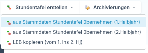 • Stundentfel erstellen: Mit dieser funktionen legen Sie den Unterricht automatisch für die jeweiligen Halbjahre an, oder übernehmen diese von 1. in das 2. Halbjahr