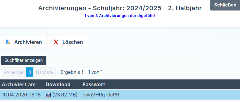 Im Bereich Archivierungen können Sie die Zeugnisse für das 1. oder 2. Halbjahr archivieren und anschließend über die Schaltfläche mit der Diskette herunterladen.