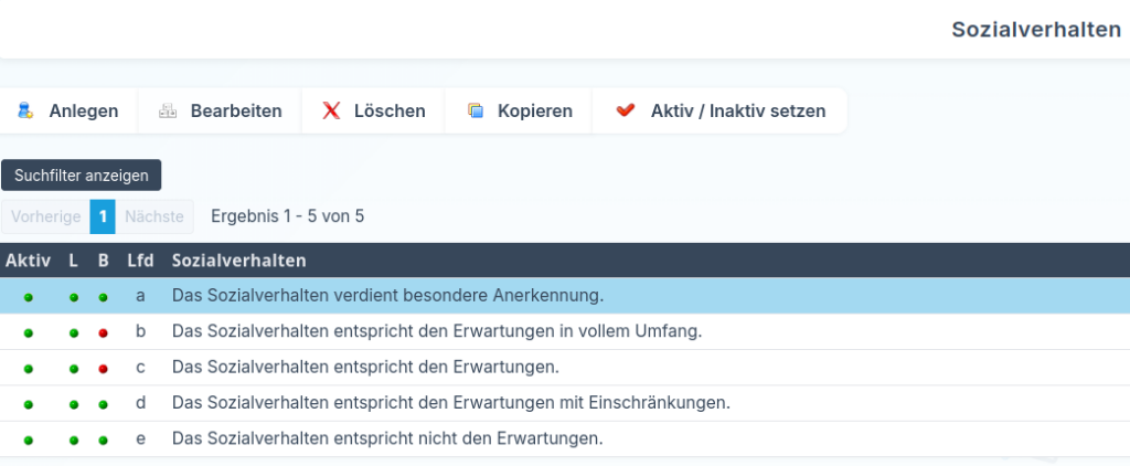 Im Bereich Stammdaten → Sozialverhalten sehen Sie alle angelegten Bewertungsstufen für das Arbeitsverhalten. Diese können von den Fachlehrkräften für den SV-Vorschlag sowie von den Klassenlehrkräften für das endgültige Sozialverhalten ausgewählt werden.