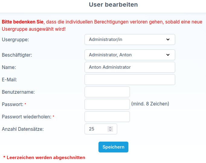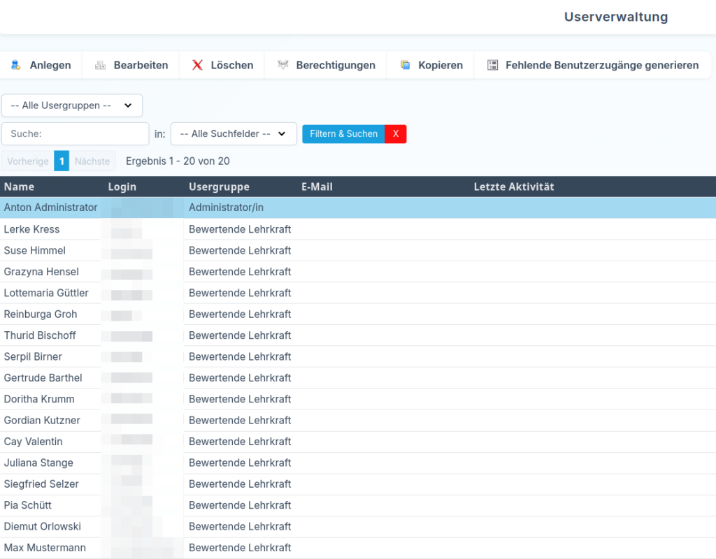 Beim Anlegen oder Bearbeiten eines Benutzerkontos wählen Sie zunächst die passende Usergruppe aus. Diese legt fest, ob es sich zum Beispiel um ein Konto für eine bewertende Lehrkraft oder um einen Administrator handelt. Je nach Auswahl erhält der Benutzer unterschiedliche Berechtigungen.