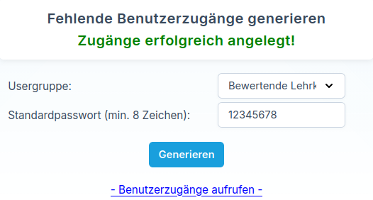 Sobald Sie die gewünschte Usergruppe ausgewählt, das Standardpasswort eingetragen und auf Generieren geklickt haben, werden alle fehlenden Benutzerzugänge angelegt.